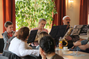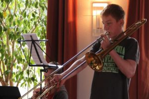 Danach zeigten die 3 auszubildenden Saxophonistinnen, dass sie ihr Instrument beherrschen, genau wie 4 Flötistinnen, die mit ihren zarten Tönen das Publikum erfreuten. Den Abschluss der Holzinstrumente gestalteten beide Klarinettenschüler mit anspruchsvoller Literatur. Daraufhin präsentierte sich das Blech, das Hornregister machte den Anfang. Im Anschluss gab es einen besonderen Auftritt von Maya Decker am Horn und Linus Decker an der Trompete, die zusammen mit ihrem Opa am Baritonsaxophon einen wunderschönen Choral und ein fetziges Rockduett zum Besten gaben. „Das Blech wird immer tiefer“ leitete Patricia Oehler den letzten Vortrag ein: Marvin Hermann glänzte an der Posaune mit einem Swing.