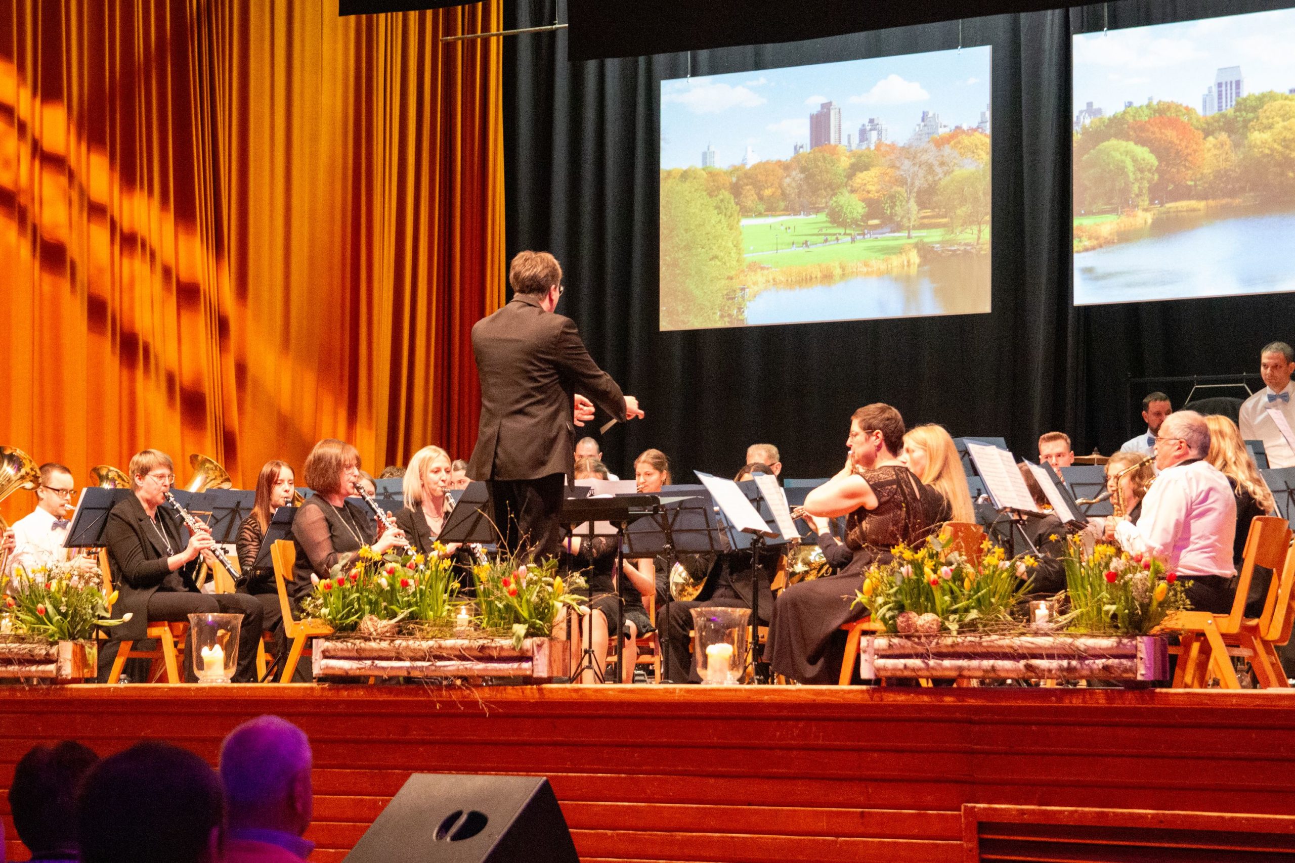 Mit kraftvollen Hornklängen sowie donnernden Paukenschlägen erklang mit „A Triumphant Fanfare“ eine majestätische Fanfare von Franco Cesarini. Dann wurden die Zuhörer auf die grüne Insel entführt mit „Dublin Dances“ von Jan Van der Roost. In dieser irischen Rhapsodie bediente sich der Komponist an irischer Folk-Musik mit drei bekannten Melodien: „Brian Boru’s Marsch“, „Der Minnesänger“ sowie „Die irische Wäscherin“. Bei diesem Stück wurden an die Kapelle hohe Anforderungen gestellt. Routiniert geleitet von Dirigent Sauer, wurde dieser Titel überzeugend dargeboten. Dann ging es nach New York, wo mit „Cityscapes“ von Jan de Haan der ganze Trubel von Manhattan förmlich zu spüren und zu hören war. Erstaunlich bei diesem Stück waren die exakten Einsätze der Kapelle, was auf harte Probenarbeit schließen lässt.