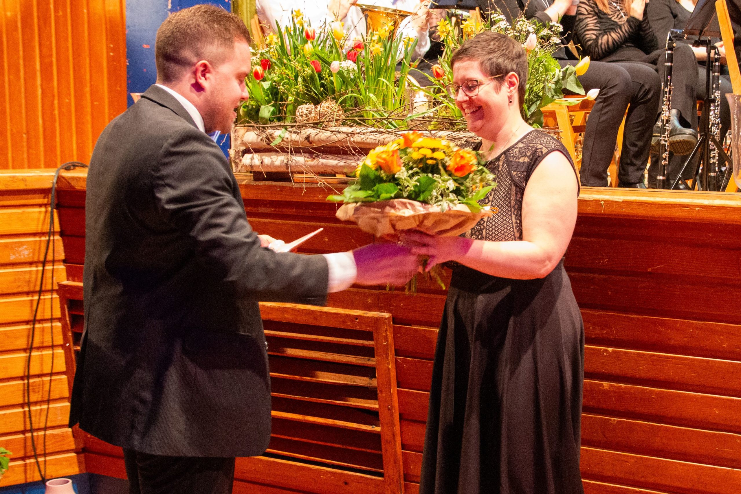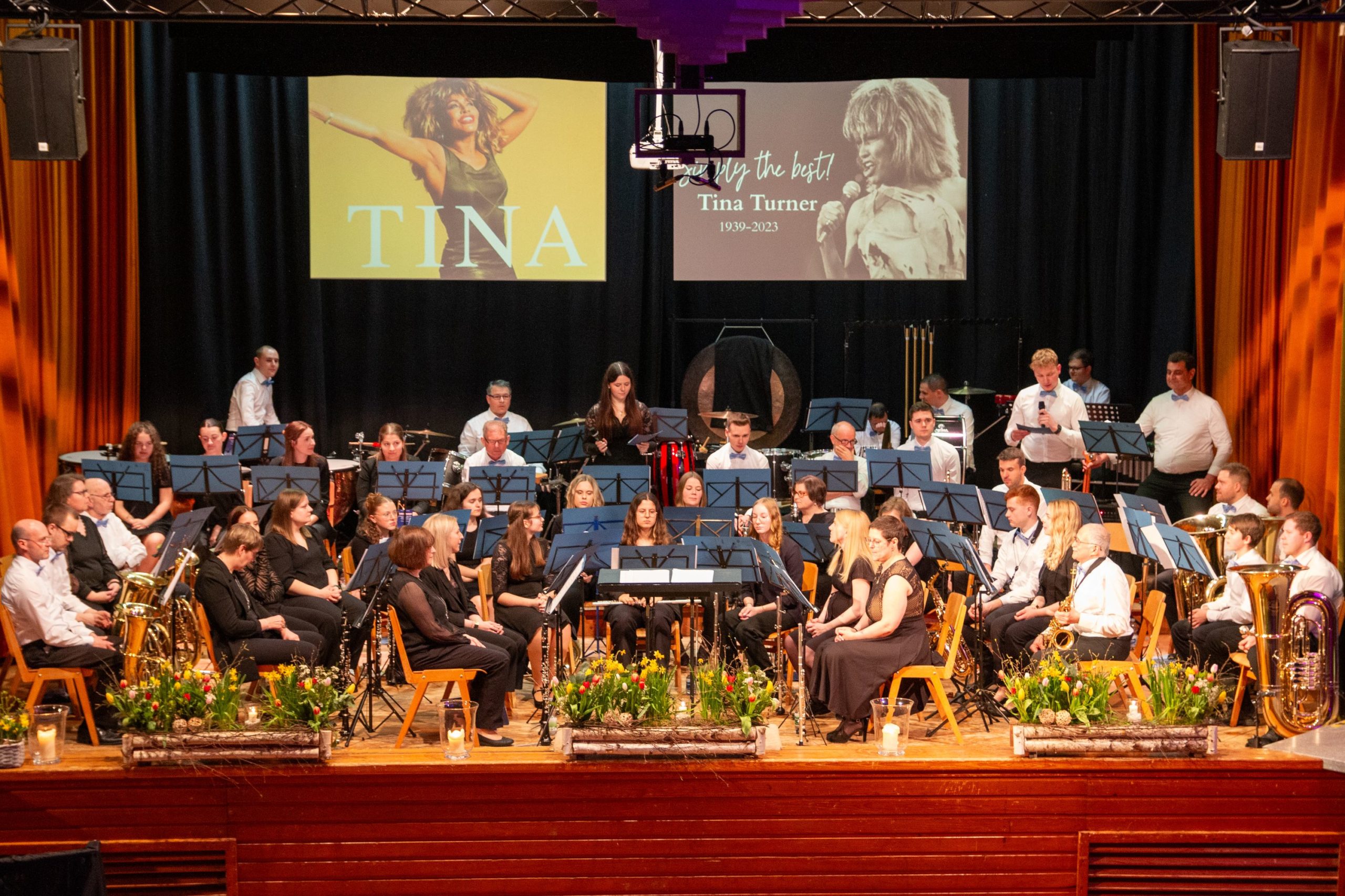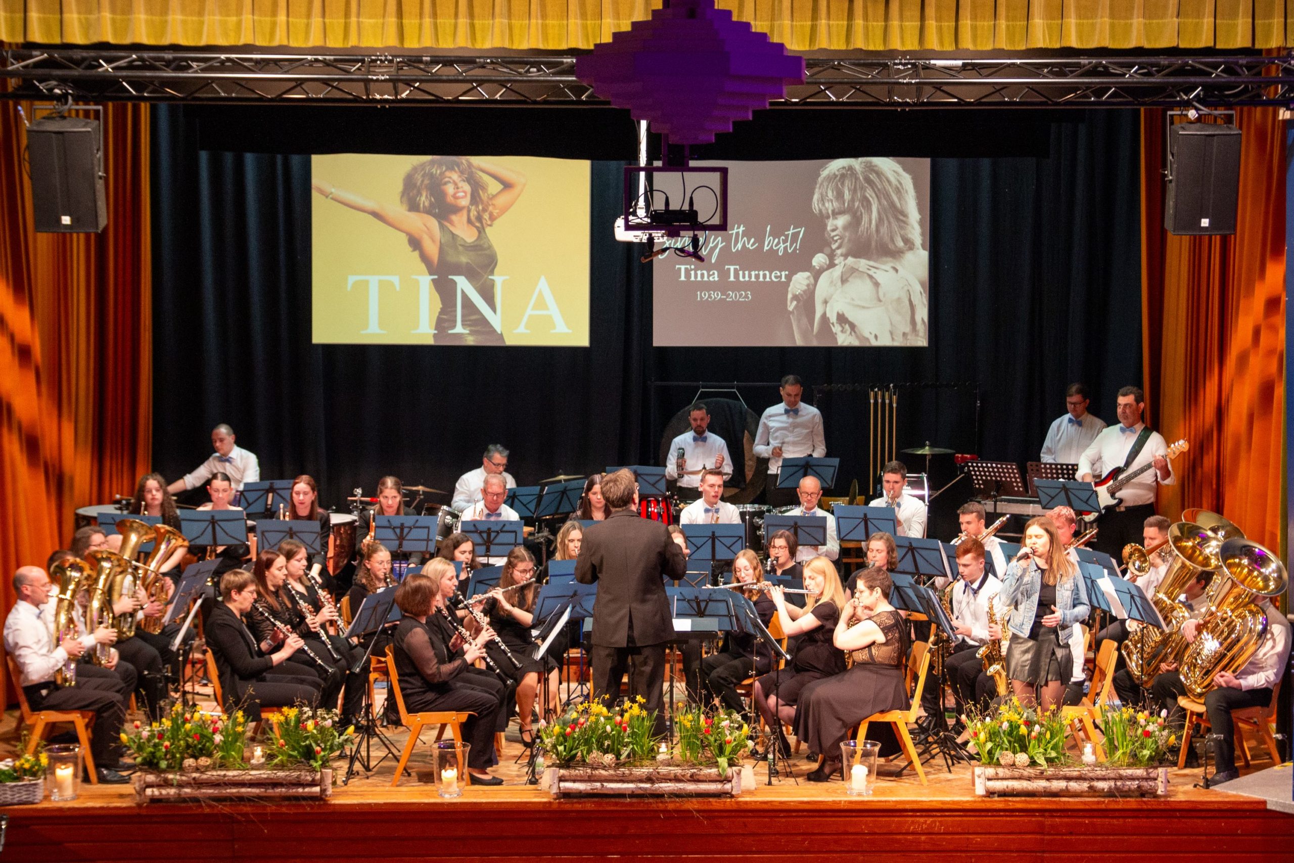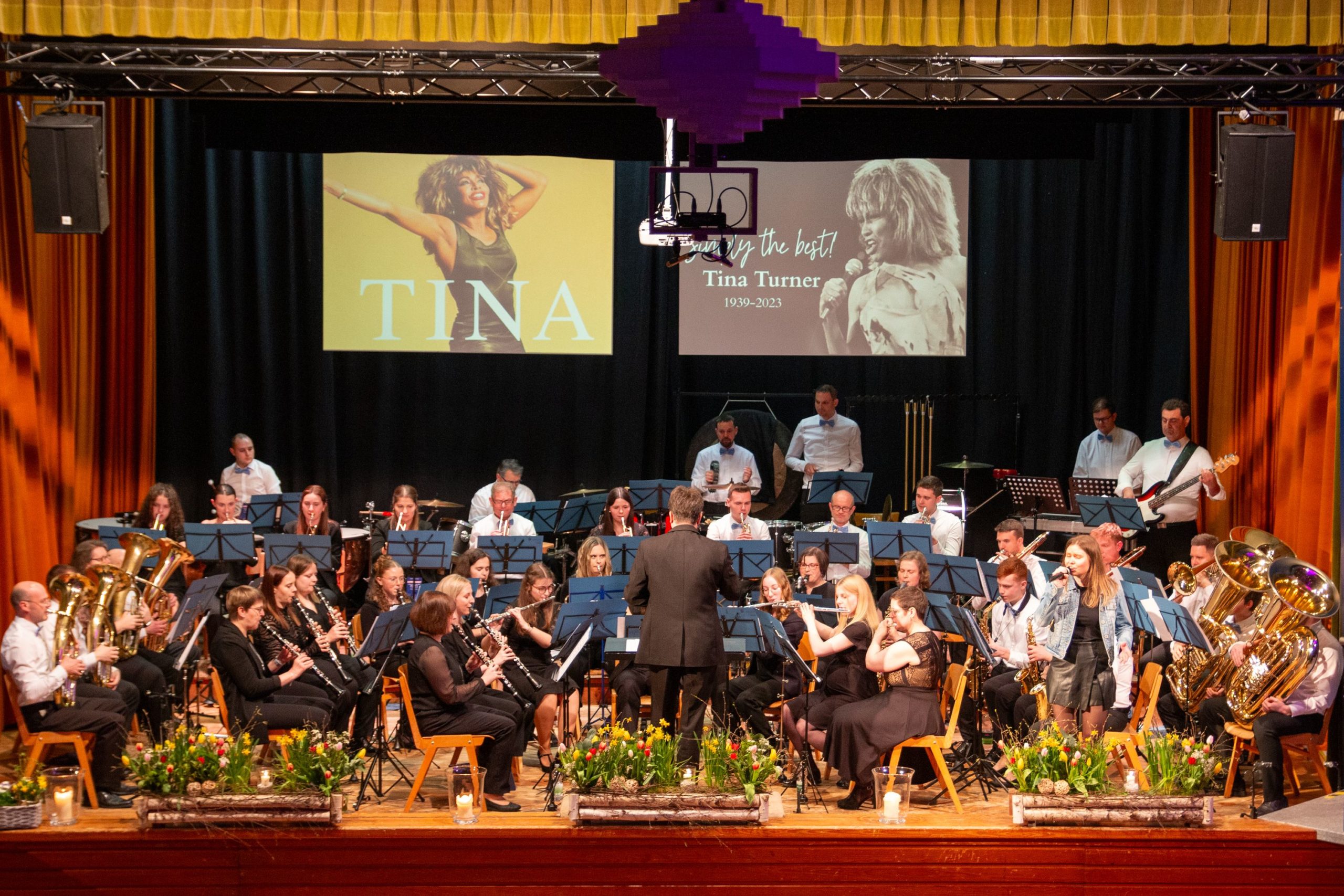 Ein Höhepunkt war der Schlusstitel aus „Tina – Das Musical“. Hier konnten die Zuhörer die Musik von Tina Turner auf der Bühne miterleben. Maren Stulz aus Oberwolfach hatte den Gesangspart mit ihrer kräftigen Stimme übernommen. Markus Sauer hat bei diesem Stück zwei der bekanntesten Lieder von Tina Turner zu einem Medley arrangiert. Die Zuhörer wurden mit den fetzigen Songs „The Best“ und „Proud Mary“ in die Welt des Rock’n Roll und der Soul-Musik mitgenommen. Maren Stulz wurde stürmisch gefeiert und für die Kapelle gab es Sonderapplaus.