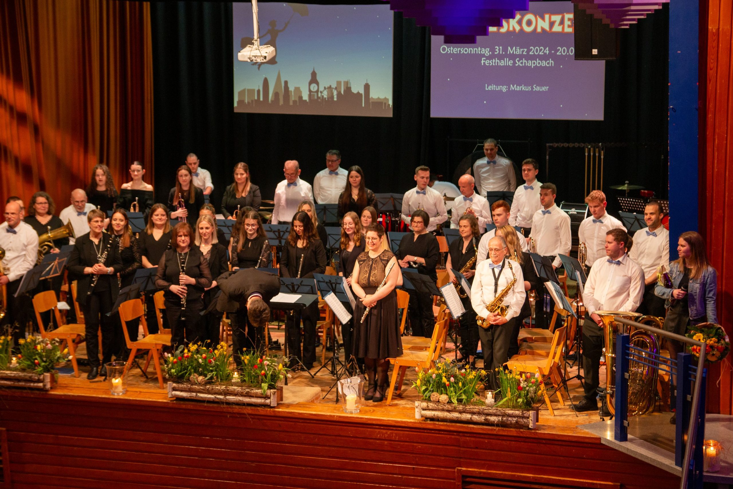 Begeistert gefeiert wurde am Ostersonntag in der vollbesetzten Festhalle der Musikverein „Harmonie“ Schapbach für sein Jahreskonzert. Es war das zweite Jahreskonzert mit Dirigent Markus Sauer, der ein abwechslungsreiches und anspruchsvolles Programm mit seinen 44 Musikern einstudiert hatte. Die musikalische Reise führte von der irischen Hauptstadt Dublin nach New York City über Prag und London zur mystischen Insel Berk und schließlich bis an den Broadway in Nashville, Tennessee. Durch das Programm führten sehr beredt Collien Roth und Marvin Herrmann.