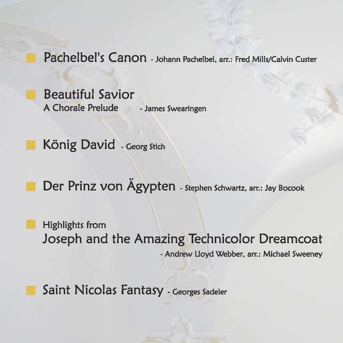Freut euch auf ein abwechslungsreiches Programm: Den festlichen Auftakt macht das zeitlose Meisterwerk Pachelbel’s Canon, gefolgt von der ergreifenden Hymne Beautiful Savior. Mit der Ouvertüre König David tauchen wir in eine der bekanntesten biblischen Geschichten ein, bevor die Musik aus dem bewegenden Film Der Prinz von Ägypten und dem farbenfrohen Musical Joseph and the Amazing Technicolor Dreamcoat erklingen wird. Abgeschlossen wird das Konzert mit der Saint Nicolas Fantasy, einem fröhlichen Medley aus traditionellen luxemburgischen Liedern über Nikolaus von Myra.